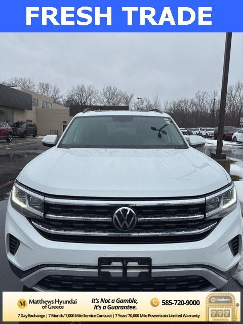 Engine: 3.6L V-6 cyl, Transmission: Automatic, Mileage: 29,859 miles miles, Exterior Color: Pure White, Interior Color: Titan Black,Stock #: GC23624A, Location: Matthews Hyundai of Greece, Comments: Pure White 2023 Volkswagen Atlas 3.6L V6 SE w/Technology AWD 8-Speed Automatic with Tiptronic 3.6L VR6 3.60 Axle Ratio, 3rd row seats: split-bench, 4-Wheel Disc Brakes, 6 Speakers, ABS brakes, Air Conditioning, Alloy wheels, AM/FM radio: SiriusXM with 360L, Auto-Dimming Rear-View Mirror, Auto-dimming Rear-View mirror, Automatic temperature control, Black Wheel Package, Brake assist, Bumpers: body-color, Compass, Delay-off headlights, Driver door bin, Driver vanity mirror, Dual front impact airbags, Dual front side impact airbags, Electronic Stability Control, Emergency communication system: VW Car-Net Safe & Secure 5-year, Exterior Parking Camera Rear, Four wheel independent suspension, Front anti-roll bar, Front Bucket Seats, Front Center Armrest, Front dual zone A/C, Front fog lights, Front reading lights, Fully automatic headlights, Heated Comfort Front Bucket Seats, Heated door mirrors, Heated front seats, Heavy Duty Trunk Liner w/VW CarGo Blocks, Illuminated entry, Leather Shift Knob, Low tire pressure warning, Occupant sensing airbag, Outside temperature display, Overhead airbag, Overhead console, Panic alarm, Panoramic Sunroof Package, Passenger door bin, Passenger vanity mirror, Perforated V-Tex Leatherette Seating Surfaces, Power door mirrors, Power driver seat, Power Liftgate, Power steering, Power Tilting & Sliding Panoramic Sunroof, Power windows, Radio data system, Radio: MIB3 Composition Media w/8" Touchscreen, Rain sensing wipers, Rear air conditioning, Rear anti-roll bar, Rear reading lights, Rear seat center armrest, Rear window defroster, Rear window wiper, Remote keyless entry, Rubber Mats Kit - Bench Seats, Security system, Speed control, Speed-sensing steering, Split folding rear seat, Spoiler, Standard Suspension, Steering wheel mounted audio controls, Tachometer, Telescoping steering wheel, Tilt steering wheel, Traction control, Trip computer, Turn signal indicator mirrors, Variably intermittent wipers, Wheels: 20" x 8J 5-Spoke Black Painted Alloy, Wheels: 20" x 8J 5-Spoke Silver Painted Alloy.