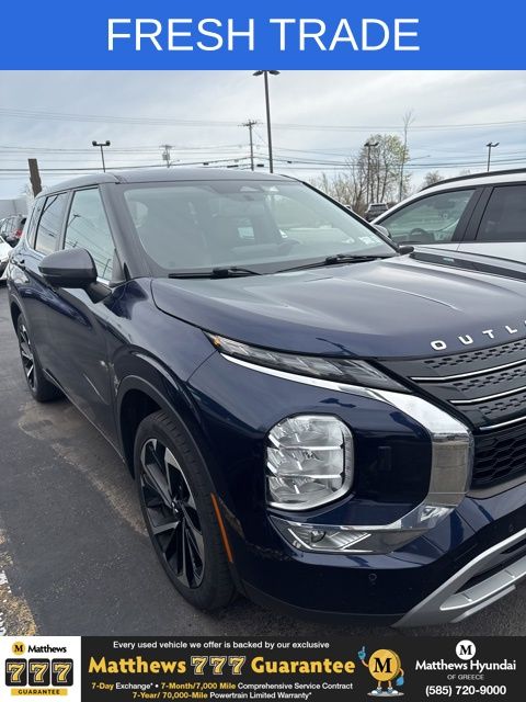 Engine: 2.5L I-4 cyl, Transmission: Variable, Mileage: 87,861 miles miles, MPG Range: 24.0/30.0, Exterior Color: Cosmic Blue, Interior Color: Black,Stock #: GC23736A, Location: Matthews Hyundai of Greece, Comments: Cosmic Blue Metallic 2022 Mitsubishi Outlander Black Edition 4WD CVT 2.5L 4-Cylinder DOHC 4WD, 3rd row seats: split-bench, 4-Wheel Disc Brakes, 6 Speakers, ABS brakes, Air Conditioning, Alloy wheels, AM/FM radio: SiriusXM, Android Auto & Apple CarPlay, Auto High-beam Headlights, Automatic temperature control, Axle Ratio: 5.694, Brake assist, Bumpers: body-color, Driver door bin, Driver vanity mirror, Dual front impact airbags, Dual front side impact airbags, Electronic Stability Control, Emergency communication system: Mitsubishi Connect w/ 24-month trial, Exterior Parking Camera Rear, Four wheel independent suspension, Front anti-roll bar, Front Bucket Seats, Front Center Armrest w/Storage, Front dual zone A/C, Front fog lights, Front reading lights, Fully automatic headlights, Headlight cleaning, Heated door mirrors, Heated Front Bucket Seats, Heated front seats, Illuminated entry, Knee airbag, Leather Shift Knob, Leather steering wheel, Low tire pressure warning, Occupant sensing airbag, Outside temperature display, Overhead airbag, Overhead console, Panic alarm, Passenger door bin, Passenger vanity mirror, Power door mirrors, Power driver seat, Power Liftgate, Power moonroof, Power steering, Power windows, Radio data system, Radio: AM/FM 8.0" Smartphone Link Display Audio, Rain sensing wipers, Rear anti-roll bar, Rear seat center armrest, Rear side impact airbag, Rear window defroster, Rear window wiper, Reclining 3rd row seat, Remote keyless entry, Security system, Speed control, Speed-Sensitive Wipers, Split folding rear seat, Spoiler, Steering wheel mounted audio controls, Synthetic Leather Seat Trim, Tachometer, Telescoping steering wheel, Tilt steering wheel, Traction control, Trip computer, Turn signal indicator mirrors, Variably intermittent wipers, Wheels: 20" x 8J Black Alloy.
