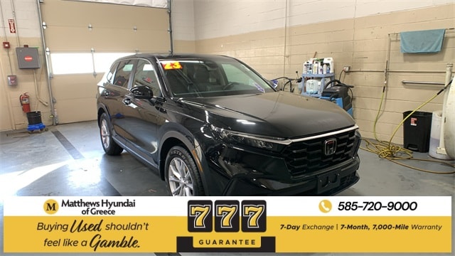 Engine: 1.5L I-4 cyl, Transmission: Variable, Mileage: 30,608 miles miles, MPG Range: 27.0/32.0, Exterior Color: Crystal Black Pearl, Interior Color: Black,Stock #: GC23417A, Location: Matthews Hyundai of Greece, Comments: Crystal Black Pearl 2023 Honda CR-V EX-L AWD CVT 1.5L I4 DOHC 16V AWD, 4-Wheel Disc Brakes, 5.64 Axle Ratio, 8 Speakers, ABS brakes, Adaptive Cruise Control: Adaptive Cruise Control (ACC) with Low-Speed Follow, Air Conditioning, Alloy wheels, AM/FM radio: SiriusXM, Auto High-beam Headlights, Auto-dimming Rear-View mirror, Automatic temperature control, Brake assist, Bumpers: body-color, Compass, Delay-off headlights, Driver door bin, Driver vanity mirror, Dual front impact airbags, Dual front side impact airbags, Electronic Stability Control, Exterior Parking Camera Rear, Four wheel independent suspension, Front anti-roll bar, Front Bucket Seats, Front Center Armrest, Front dual zone A/C, Front reading lights, Fully automatic headlights, Heated door mirrors, Heated Front Bucket Seats, Heated front seats, Illuminated entry, Knee airbag, Leather Seat Trim, Leather Shift Knob, Leather steering wheel, Low tire pressure warning, Memory seat, Occupant sensing airbag, Outside temperature display, Overhead airbag, Overhead console, Panic alarm, Passenger door bin, Passenger vanity mirror, Power door mirrors, Power driver seat, Power Liftgate, Power moonroof, Power passenger seat, Power steering, Power windows, Radio data system, Radio: 320-Watt AM/FM/HD/SiriusXM Audio System, Rear anti-roll bar, Rear reading lights, Rear seat center armrest, Rear side impact airbag, Rear window defroster, Rear window wiper, Remote keyless entry, Security system, Speed control, Speed-sensing steering, Speed-Sensitive Wipers, Split folding rear seat, Spoiler, Steering wheel mounted audio controls, Tachometer, Telescoping steering wheel, Tilt steering wheel, Traction control, Trip computer, Turn signal indicator mirrors, Variably intermittent wipers, Wheels: 18" Sparkle Silver Metallic, Wireless Apple CarPlay/Wireless Android Auto.