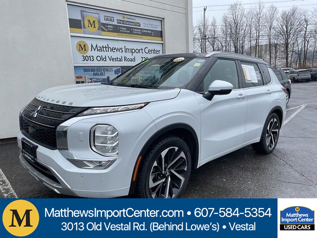 White 2023 Mitsubishi Outlander 4WD CVT 2.5L 4-Cylinder DOHC24/30 City/Highway MPGMatthews Import Center promises each customer a thorough and confident 120-point inspection on our used inventory guaranteeing a relaxing and peace-of-mind experience. We are located behind Lowes in Vestal NY. Or call us at (607) 729 - 6261 Matthews Import Center 3013 Old Vestal Road Vestal NY 13850.Odometer is 21117 miles below market average!